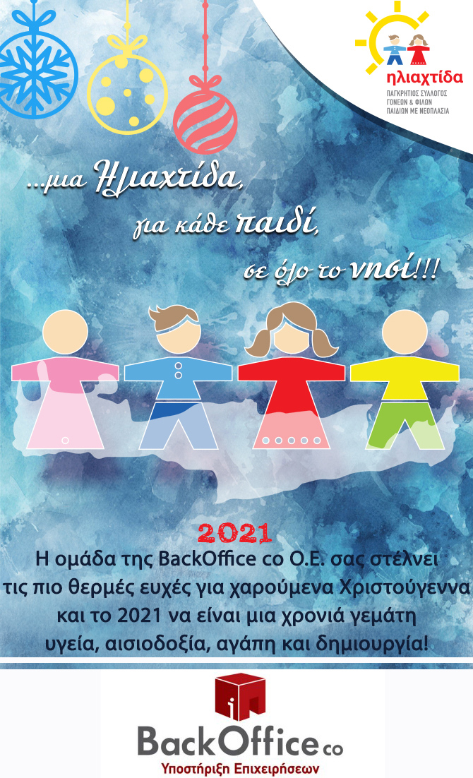 23/12/2020Η ομάδα της Backoffice co OE αποφάσισε φέτος να στείλει τις εορταστικές της ευχές, συμβάλλοντας στον στόχο της «Ηλιαχτίδας» που είναι η διασφάλιση των όσο το δυνατόν καλύτερων συνθηκών περίθαλψης των παιδιών με νεοπλασματικά νοσήματα και η συμβολή της στην άνετη παραμονή τους στην Κλινική καθ’ όλη τη διάρκεια της νοσηλείας τους.